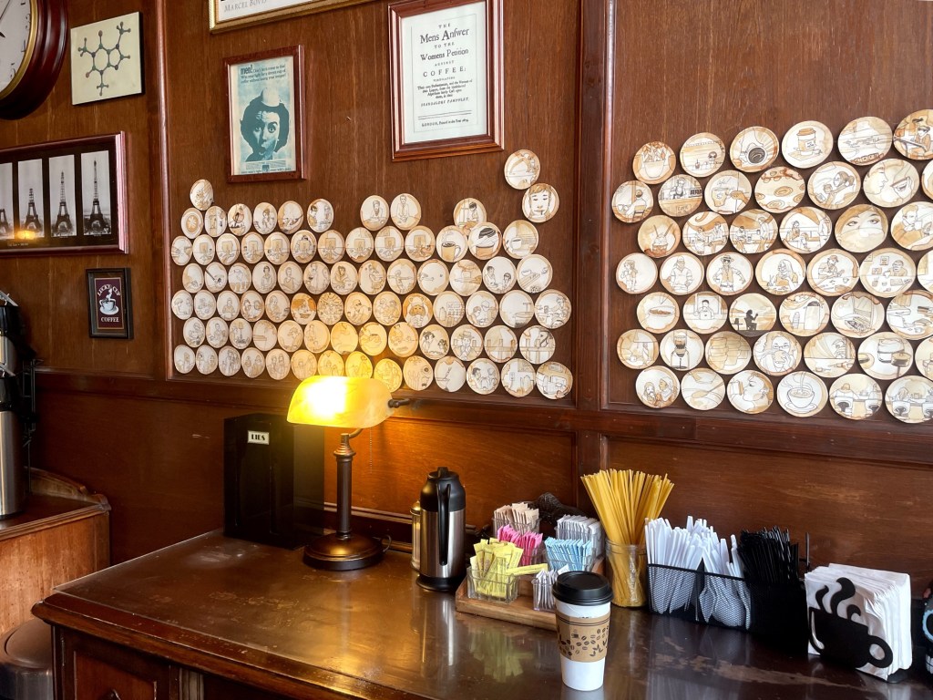 Now in its 25th year, The Bitter End occupies a short building tucked between its taller neighbors. It retains the roots of the historical bank it’s housed in, through high ceilings and dark wooden tables. The walls are saturated with dark and moody artwork, plus the long menu behind the bar. Dark tables, chairs, deep mahogany walls, and accent tables darken the space and give mind to a rainy midnight cafe in a lonely corner of New York.